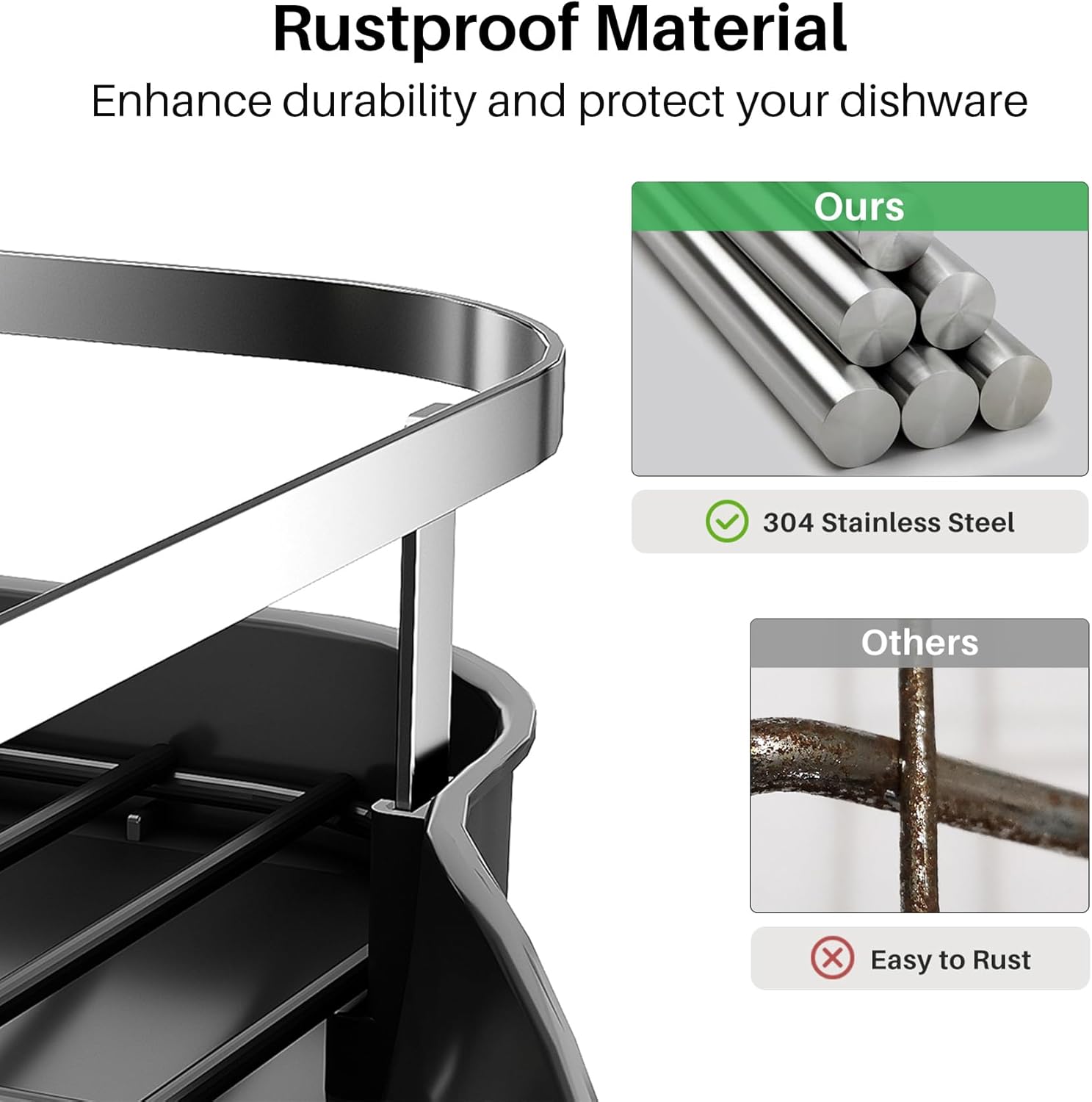 Dish Drying Rack, Expandable Dish Rack for Kitchen Counter, Stainless Steel Dish Drainer with Drainboard Set and Utensil Holder (Black)