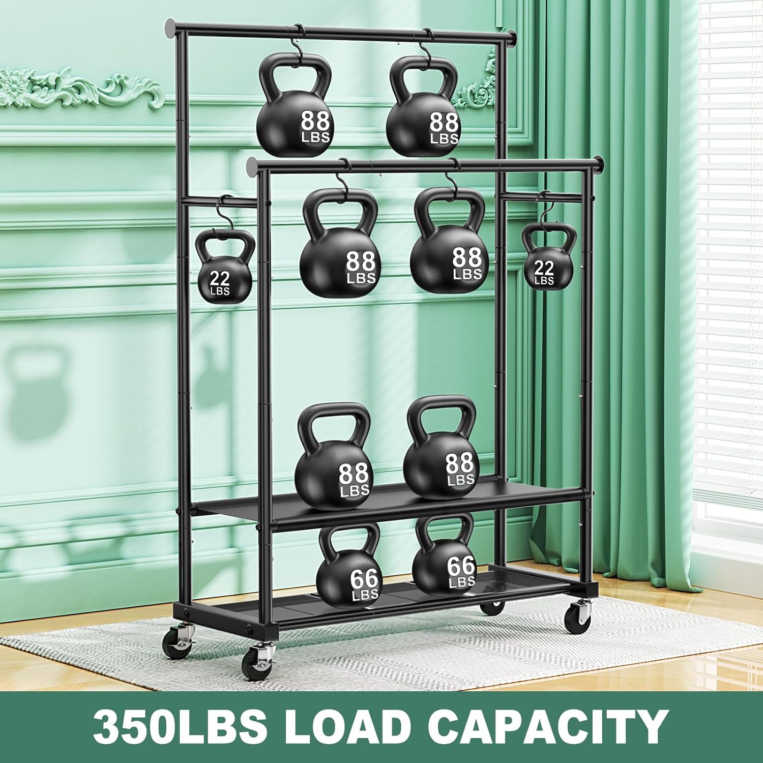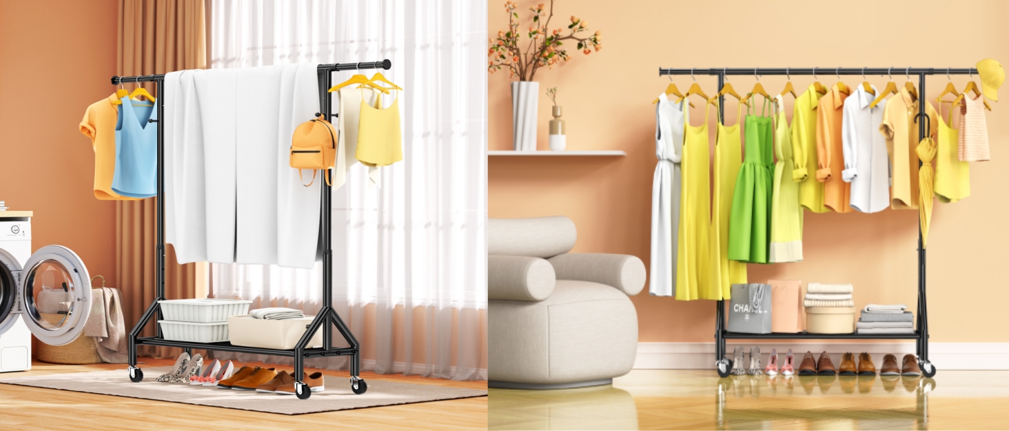 Double Rods Clothes Rack for Hanging Clothes, Heavy Duty Rolling Clothing Rack with Wheels, Freestanding Garment Racks with Oxford Bottom Shelf and Mesh Bottom Shelf for Bedroom Laundry Living Room