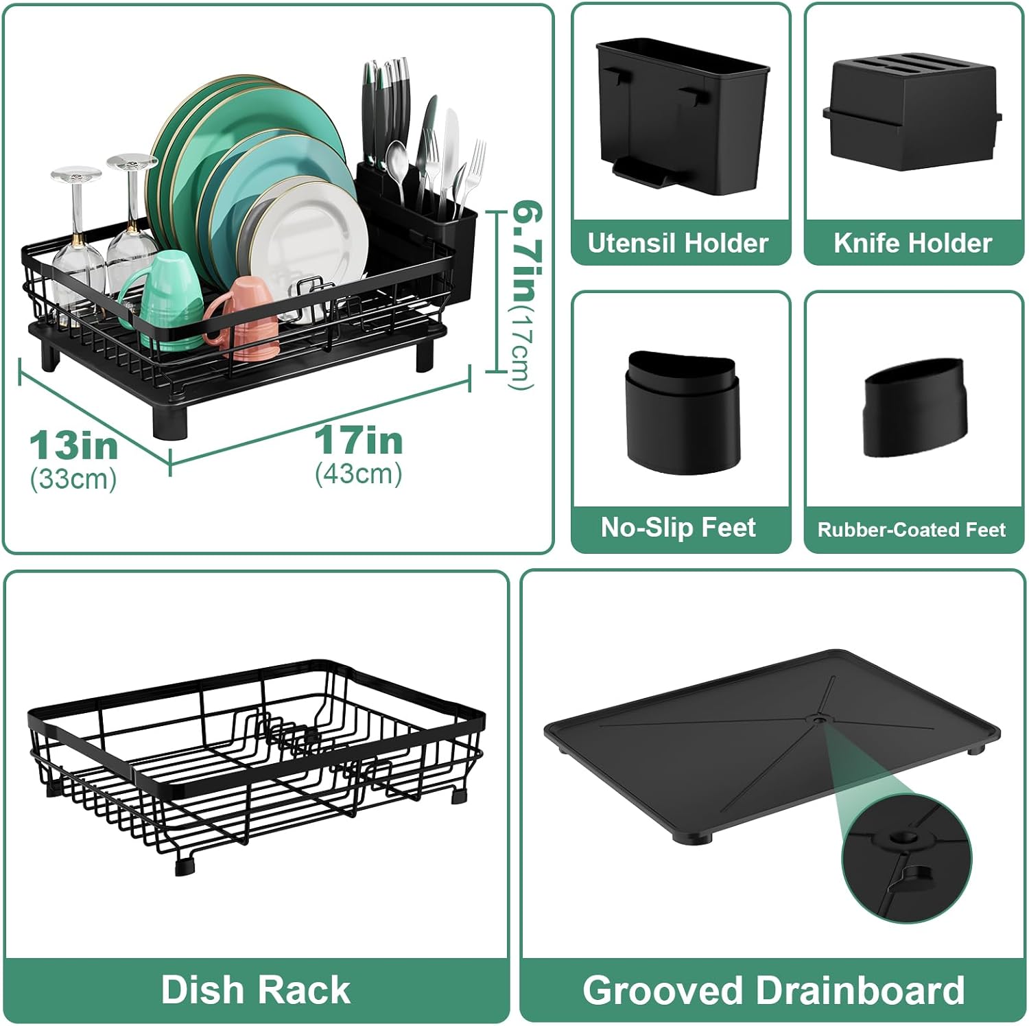 - Black dish rack with drain tray